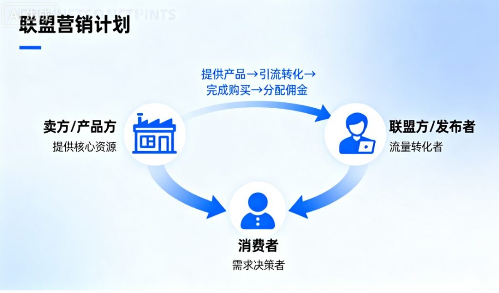 卖方涵盖个体承包商、创业团队、小微企业、大型制造商等各类主体,推广标的既包括实物产品(如家电、服饰),也涵盖服务(如出行平台、在线课程)。值得注意的是,卖方无需全程参与推广:例如滴滴、美团等平台型企业,可通过与各类网站、博主合作联盟计划,借助外部流量拓展新用户,自身则聚焦核心业务运营。 - 联盟方 / 发布者:流量转化者,链接供需两端